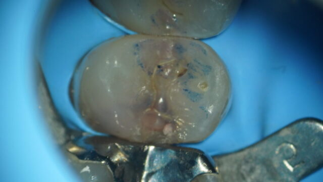フロスすると染みる治療方法 マイクロスコープ(精密な治療をする為の歯科用顕微鏡)とラバーダム(雑菌が入らないようにかけるゴムのシート)を使用して虫歯を全て除去します。