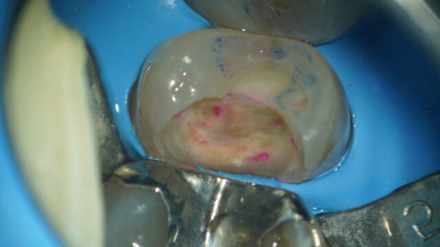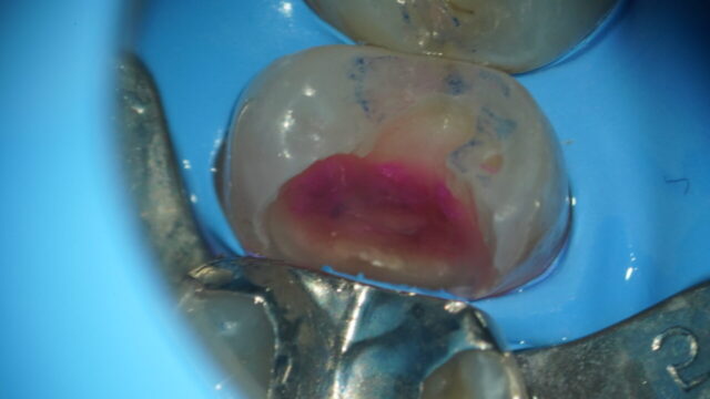 虫歯の上からアプローチしていき、中で虫歯がどれほど広がっているのか少しずつ削って確認していきます。 -