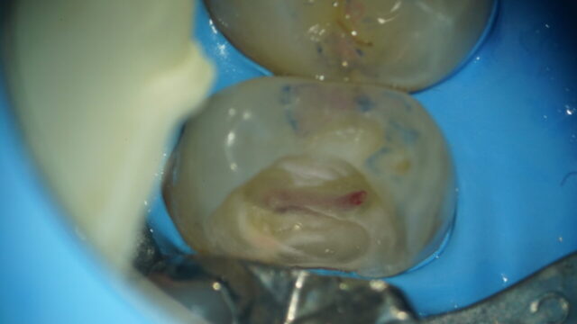 これは神経の穴です。虫歯を完全に除去するために削っていて神経の穴が露出しました。これをマイクロスコープがあると簡単に神経の穴が露出したと分かりますが、肉眼だと見逃されてしまうことがあります。 -