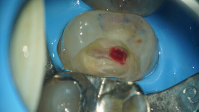 虫歯が神経の穴に近接していたので一部の神経を除去する、歯髄断髄法をして止血するか確認します。