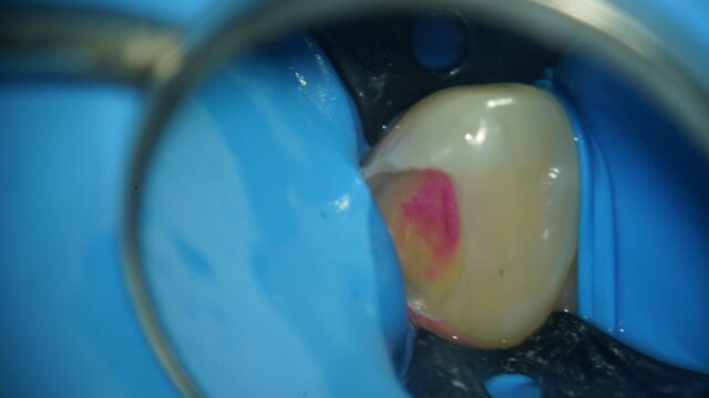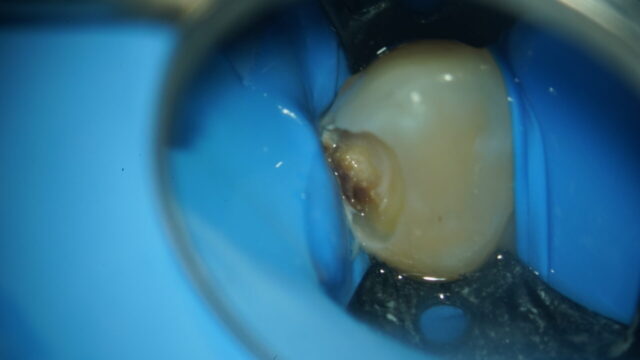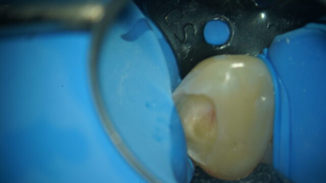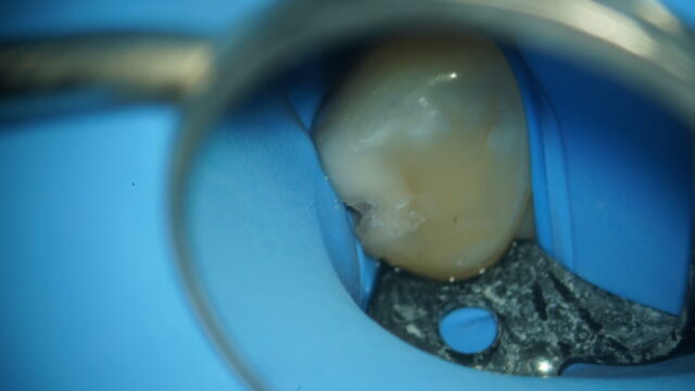 マイクロスコープ(精密な治療をする為の歯科用顕微鏡)とラバーダム(雑菌が入らないようにかけるゴムのシート)を使用して虫歯だけを削り健康な歯を削らないように精密な治療を行います。