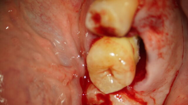 抜歯が必要になり、インプラントか、親知らずを移植するかとの選択で移植を選択されました。治療方法 割れてしまった歯と移植に使用する親知らずを同時に抜歯します。