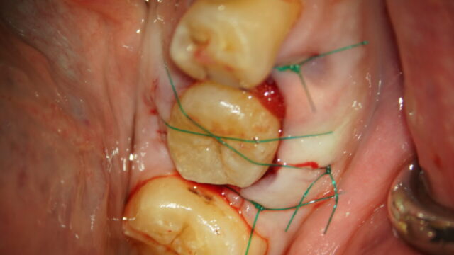 造骨材を詰めたら縫合して移植した歯を固定します。