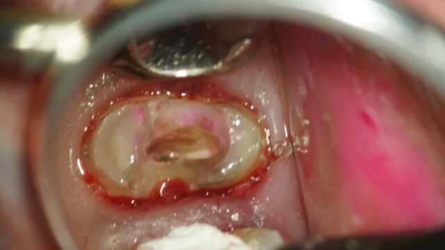 一度他院で根の治療をされいていた歯で根の病気が再発して再感染を起こしていました。治療方法 裏から穴を開けて再根管治療を行います。