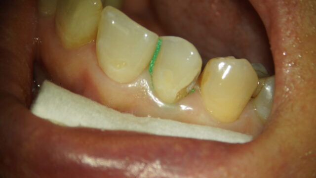 当院ではよく圧排糸(歯茎に入れる糸)を使用して、歯茎を押し下げる、更に、歯肉溝滲出液を防ぎます。