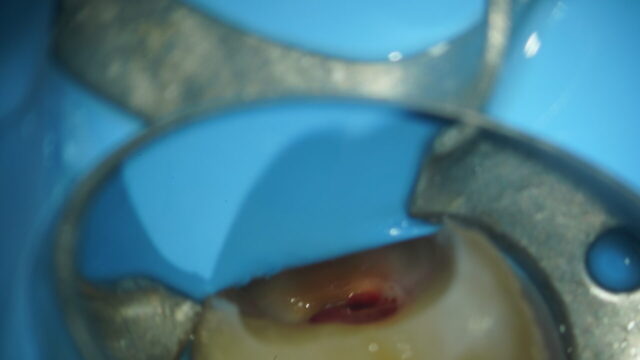 フロスすると染みる治療方法 マイクロスコープ(精密な治療をする為の歯科用顕微鏡)とラバーダム(雑菌が入らないようにかけるゴムのシート)を使用して虫歯を全て除去します。